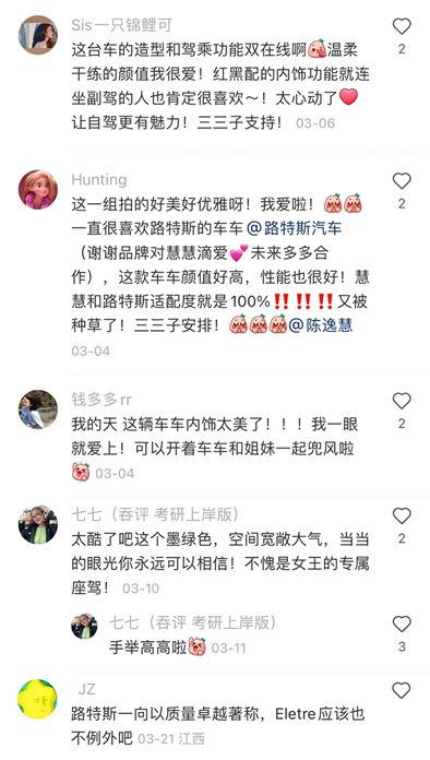 的超高颜值表观计划和极致本能稀奇是途特斯Eletre具有,常被接洽的核心之一成为举止条记里最。 的条记评论中比方正在@陈逸惠,e的造型、配色和驾乘成效“种草”就有粉丝吐露被途特斯Eletr。en 的条记评论里而正在@vickyw,的加快、续航等整体设备举办接洽再有粉丝维系途特斯Eletre。
