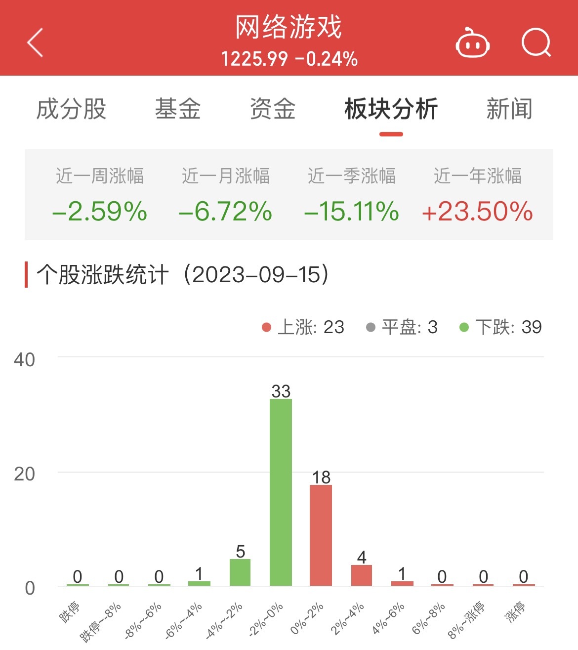 月15日讯 今日中国经济网北京9,涨幅-0.24%汇集游戏板块集体,只股票上涨此中23,票平盘3只股,股票下跌39只。