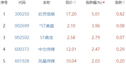中其,文传媒和凤凰传媒位列板块涨幅前五位初灵音讯、*ST美盛、ST鼎龙、中,2.79%、2.47%和2.03%涨幅分辩为5.01%xg111企业邮局3.96%、。