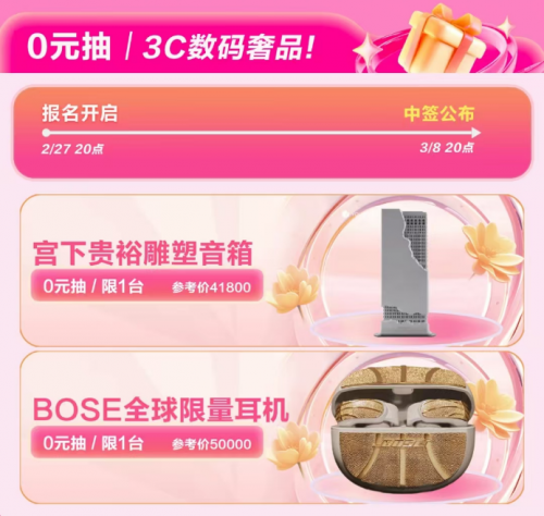 .8节营谋光阴京东3C数码3,抽3C数码奢品”营谋赢好礼用户可正在营谋会场出席“0元。即可获取抽签码出席抽奖实行轨则提示的互动义务,on Ultra绽放式耳机、宫下贵裕雕塑音箱等繁多3C数码爆款产物都时机0元带回家Xiaomi Buds 5 Pro蓝牙耳机、Bose x Victor Solom。中奖概率越大抽签码越多,用户记得多多出席互动思要进步中奖时机的。