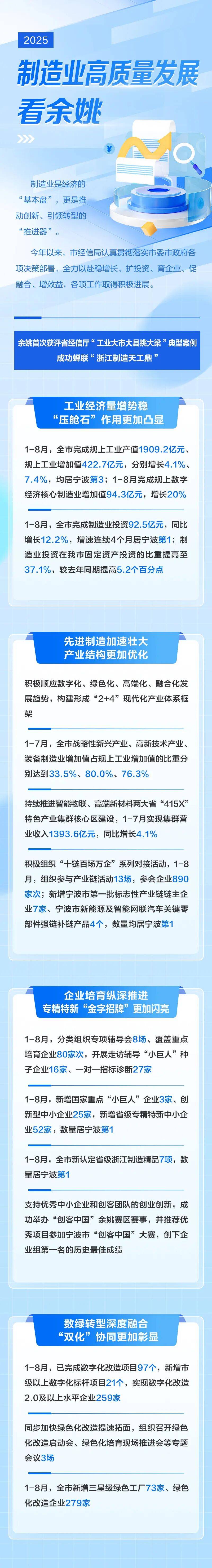 量增势稳工业经济,影响愈加凸显“压舱石”。8月1-,亿元、规上工业扩展值422.7亿元全市达成规上工业产值1909.2,1%、7.4%区分伸长4.,波第3均居宁;心创造业扩展值94.3亿元1-8月达成规上数字经济核,20%伸长。物业链集群盘绕上风,项目打算与攻坚强化细分规模,两新”计谋机会踊跃掌握国度“,级扩面、镇街清零”攻坚手脚全部发展年度技改项目“市,新和数字化绿色化改造开导企业聚焦装备更,8月1-,投资92.5亿元全市达成创造业,12.2%同比伸长,月居宁波第1增速连接4个;投资的比重普及至37.1%创造业投资正在我市固定资产,5.2个百分点较旧年同期普及。